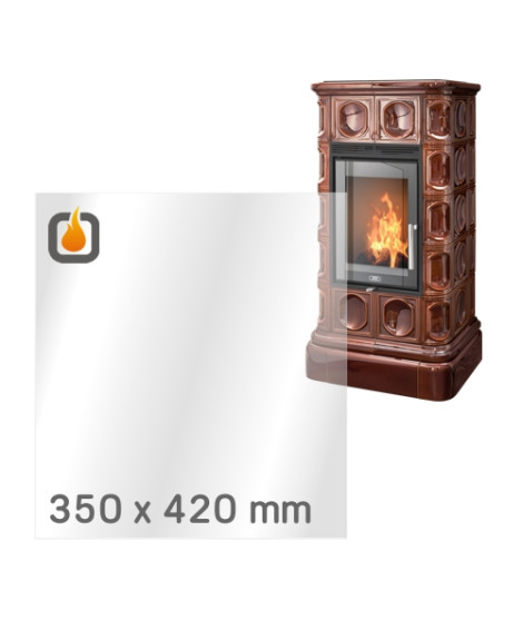 Das Glas hat die Masse 350 x 420 mm und eine Dicke von 4 mm. Es ist klar, beidseitig identisch und ideal als Ersatz für das originale Sichtglas Ihres Kaminofens.