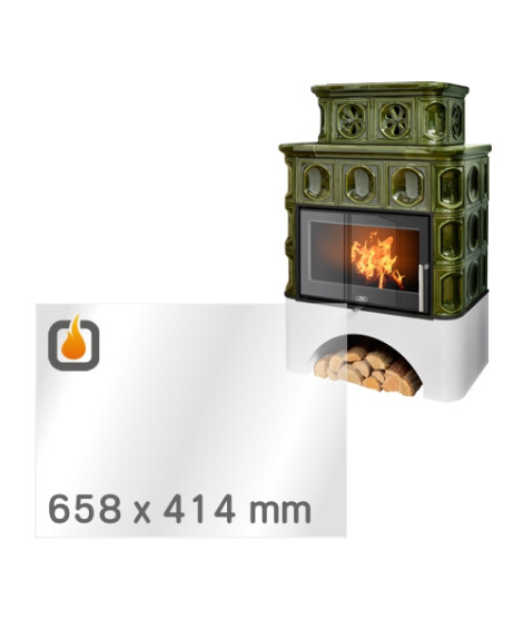 Das Glas hat die Masse 658 x 414 mm und eine Dicke von 4 mm. Es ist klar, beidseitig identisch und ideal als Ersatz für das originale Sichtglas Ihres Kaminofens.