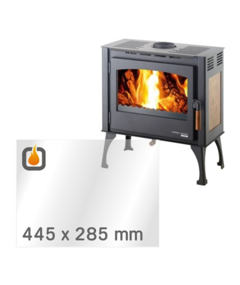 Das Glas hat die Masse 445 x 285 mm und eine Dicke von 4 mm. Es ist klar, beidseitig identisch und ideal als Ersatz für das originale Sichtglas Ihres Kaminofens.