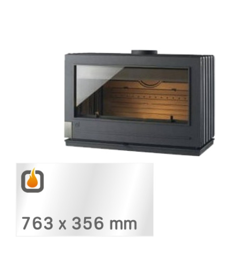 Das Glas hat die Masse 763 x 356 mm und eine Dicke von 4 mm. Es ist klar, beidseitig identisch und ideal als Ersatz für das originale Sichtglas Ihres Kaminofens.